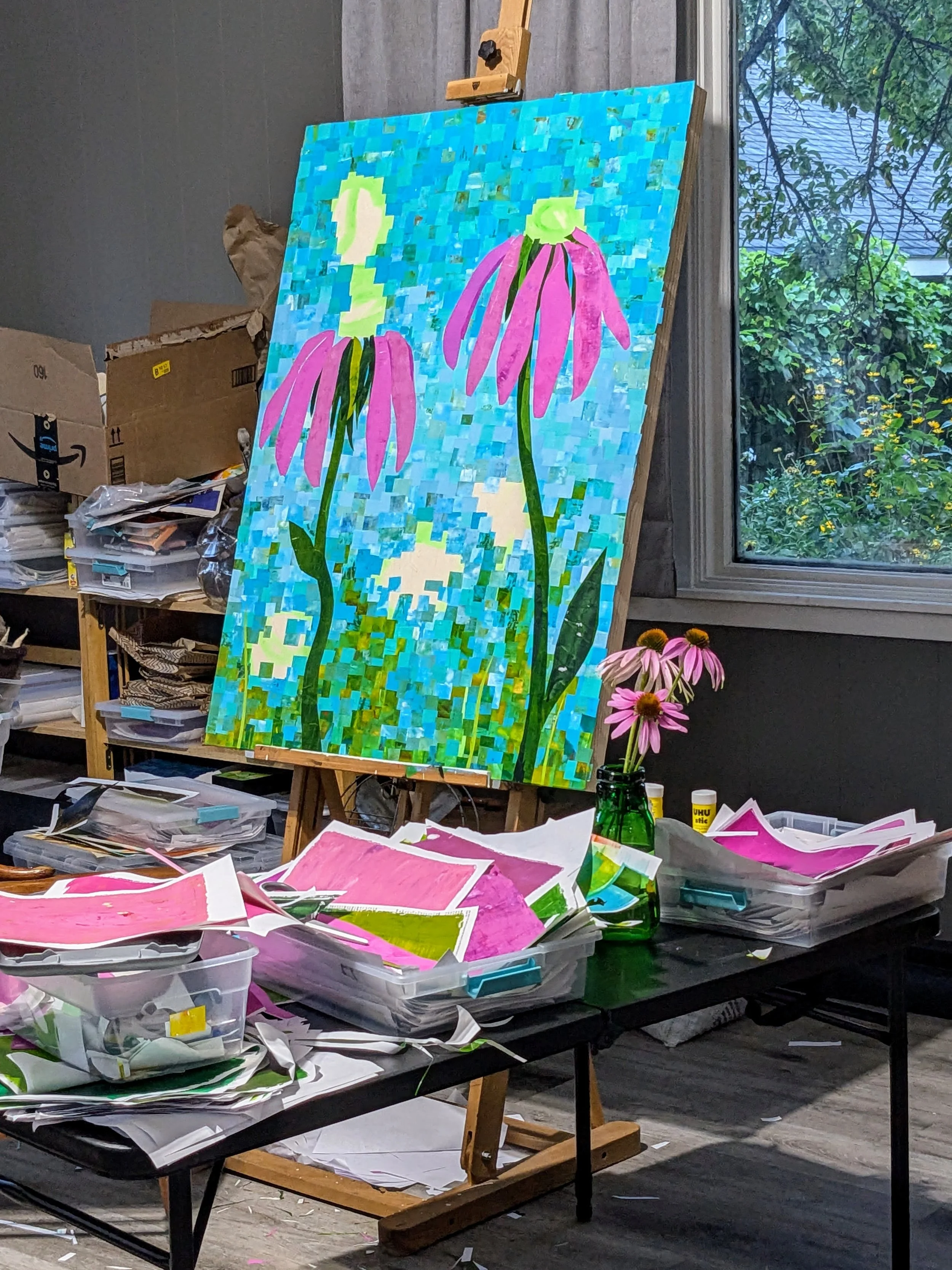 Using a gelli plate and acrylic paints, I print each piece of paper used in my collages, by hand, through a process called monoprinting. Working in this medium reignited something in me, and is where I am currently spending most of my creative time. Those monoprinted papers create a painterly effect, and I often layer papers so that shapes beneath the surface become visible when viewed from just the right angle, like secrets. My color choices and design style are typically vibrant takes on nature with folk art influences. I think of these as paper illustrations.